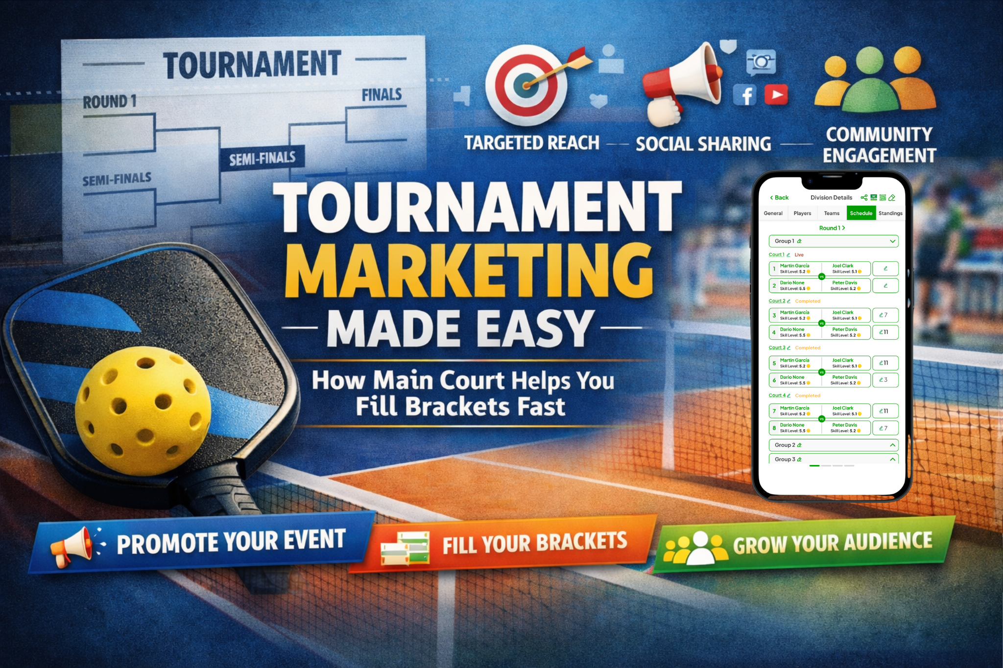 Running a pickleball tournament is exciting, but promoting it can quickly become the most stressful part. Between filling brackets, reaching the right skill levels, and making sure players actually see your event, tournament marketing often feels like a full-time job. The good news is that with the right tools, tournament promotion doesn’t have to be complicated. Main Court was built to simplify tournament marketing and help organizers fill brackets faster by putting events directly in front of the players most likely to sign up.