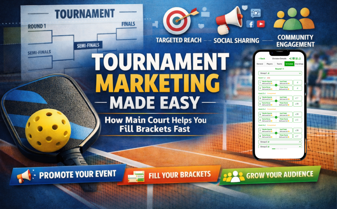 Filling tournament brackets doesn’t have to be stressful. From targeted promotion to built-in social sharing, here’s how Main Court makes tournament marketing easier and helps organizers reach the right players faster.
