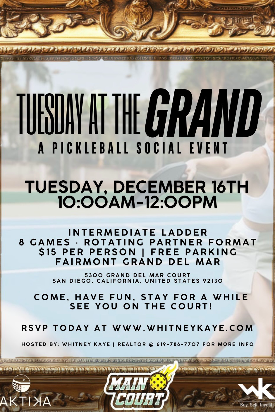 Join us for a fun intermediate social ladder! 4 Courts • 10 Minute Games • Rotating Partners • Chutes & Ladders • Music. Contact Whitney K. for more info Presented by Taktika & Whitney Kaye - San Diego Realtor